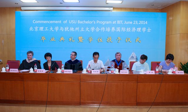2014年6月23日下午,国际教育学院在北理工国际教育交流中心三层报告厅隆重举行了44118太阳成城集团与美国犹他州立大学合作办学项目第八届学生毕业典礼。出席毕业典礼的有犹他州立大学副教务长Robert W. Wagner教授及其助理John Mortensen先生、亨茨曼商学院国际项目学术主任Dwight Israelsen教授、44118太阳成城集团孙逢春副校长、国际交流合作处邢清清副处长、国际教育学院梅文博院长、罗佳书记、蒋志湘副院长、学院部分教职工、全体毕业生及部分学生家长。梅文博院长主持典礼。