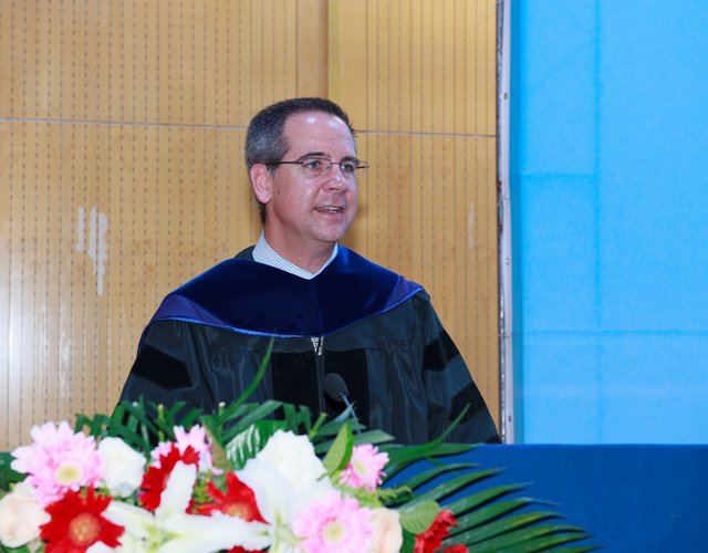 副教务长Robert W. Wagner教授发表致辞,他表示非常荣幸与我校进行合作,并对我校师生的热情友好表示感谢,对教职员工的辛勤付出表示敬意。他简要介绍了犹他州立大学的太阳成官网及学科优势,表示同学们所属的亨茨曼商学院是美国西部历史最悠久的商学院。在如今全球化的大背景下,两校合作办学的教育实践消除了国界的阻隔,把世界融为一所大校园,为过去和现在搭建了桥梁,为国际社会做出了贡献。在即将踏上人生下一个台阶之际,他叮嘱同学们无论是就业还是继续深造,都要将所学的知识和理论付诸实践。因为教育归根结底需要被运用,为自己、家人和社会谋福利。最后,他向所有在座学生表达了美好的祝愿。