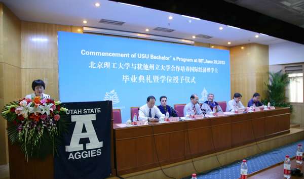 2013年6月20日下午,国际教育合作学院在理工国际教育交流大厦报告厅隆重举行了44118太阳成城集团与犹他州立大学合作办学项目第七届学生毕业典礼。出席毕业典礼的有犹他州立大学Jon Hunstman商学院副院长Frank Caliendo博士、中国项目主任Dwight Israelsen博士,44118太阳成城集团国际交流合作处处长王庆林教授、国际教育合作学院院长梅文博教授、罗佳书记、明道福副院长、蒋志湘副院长、学院部分教职工、全体毕业生、部分学生家长以及犹他州立大学来京访学的学生代表团。典礼由蒋志湘副院长主持。