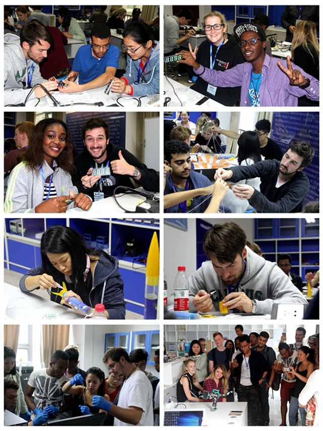 中外营员们参观了良乡校区大学生科技创新实践基地,在老师们的精心指导下电子坊完成了电子时钟的制作;在机械加工坊完成了小火箭制作中并到操场发射了小火箭,当同学们亲手点燃发射器,小火箭飞上天的一刹那,大家的成果赢得了所有人的欢呼和掌声;在生态坊,同学们仔细认真地配兑试剂,在助教的指导下,营员都完成了纳米银和荧光剂的制作;机器人坊为同学们进行了机器人跳舞表演,大家都表现出极大的兴趣。此外,同学们还进行了3D创意坊的虚拟现实体验,对Leap Motion中的虚空摘花、Unity游戏中的密室逃脱等环节不断尝试。