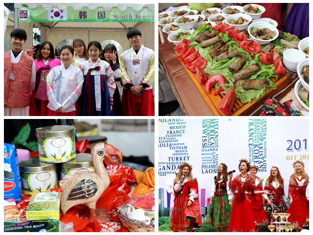 在舞台区,各国准备的文艺表演赢得观众满场喝彩:中国功夫气势恢宏;金发碧眼的俄罗斯、波兰姑娘们为我们演绎了一场温婉动人的江南伞舞;南非的学生带来了热情奔放的舞蹈,让观众们一下子梦回非洲;我们还有来自尼日利亚、哈萨克斯坦、巴拿马等国家的留学生组成的BIT International合唱团,动听的演唱让观众如痴如醉。拍照区一个个生动立体的卡通形象吸引了大小观众纷纷前来合影留念。不同国度、不同民族的国际文化元素在这里精彩绽放、交融升华!