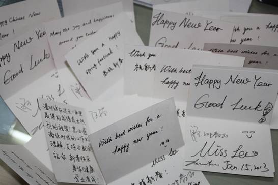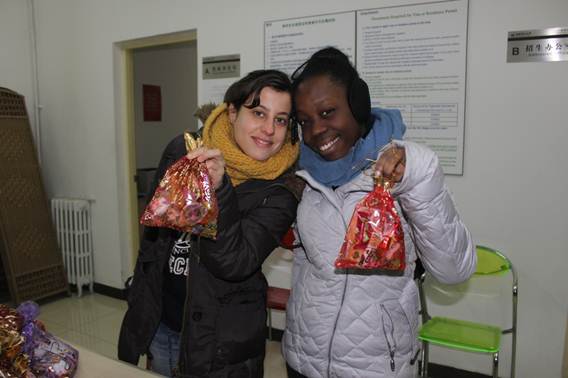 留学生中心主任汪滢带领员工在一个个喜庆的“福袋”里装满糖果,每一个福袋里都有一张老师们亲手书写的节日祝福贺卡,表达了学校对留学生和港澳台交换学生们最深切的关心和祝福。