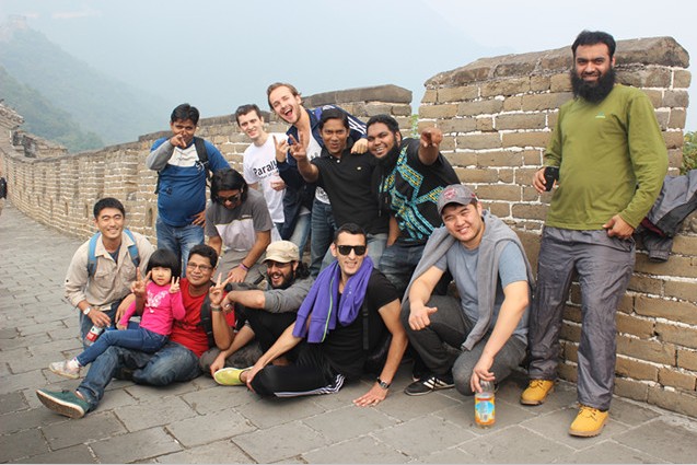 一进入口,同学们就三五成群,结伴而行,好像体内储存了无限的能量般,想要征服这一眼望不到头的长城。有的同学体力甚好,才一会儿就甩开其他同学一大截;有的看似人高马大,却几步就气喘吁吁,看来还须多锻炼。还有抱小孩爬的,一点儿也不示弱,不得不让人佩服。来自德国的留学生安妮表示,慕田峪长城给了她很大的惊喜,这里的人没有八达岭那么多,风景却毫不逊色。印尼留学生拉卡既不想落在最后,又怕错过美景,一路上可忙坏了,一会儿跟朋友拍几张,一会儿小跑几步,还不忘跟老师们也合个影。几个巴基斯坦的学生每走到标志性建筑旁,都要集体摆各种pose拍照纪念,再好吃好喝一通,然后继续行进。