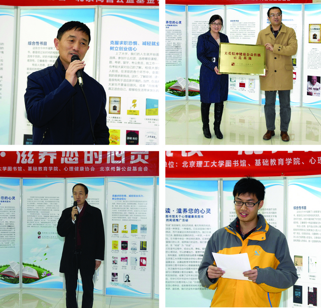 在启动仪式上,校长助理姚利民老师和基础教育学院常务副院长张青山发表了热情洋溢的讲话。姚利民老师在发言中提到读书对个人成才的重要性,更提出了在新媒体时代,人们吸收到的多是碎片化的信息,而选择一些好书进行系统的深阅读显得尤为重要,督促同学们“多读书,读好书,读会书”。张青山院长讲述了他的读书心得,殷殷期盼同学们多读好书,从阅读中感受不同的人生,在阅读中平衡心境,增强心理素质。张院长还引用了曾国藩的六字名言 “有志有识有恒”激励同学们通过阅读完善自己、发展自己、成长自己。学校心理健康协会宋昱同学代表学生发言,从另一个角度揭示出大学生精神健康方面所存在的问题。北京尚善公益基金会的伍华秘书长介绍了基金会概况及其在关爱大学生精神健康方面所做的工作,并代表尚善基金会向图书馆赠书和授牌(“关爱精神健康公益传播示范基地”)。