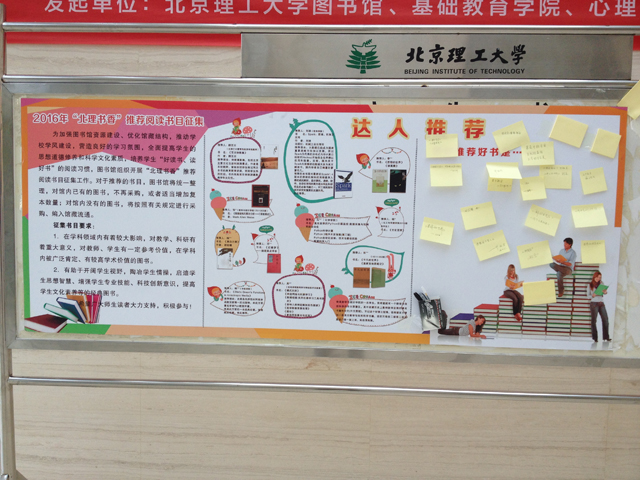“书香北理”阅读推广书目征集,图书馆“线上线下”广泛邀请读者推荐好书书目,整理好活动前期师生们推荐的阅读书目,设计制作成展板推荐给更多读者,并吸引更多读者推荐好书。