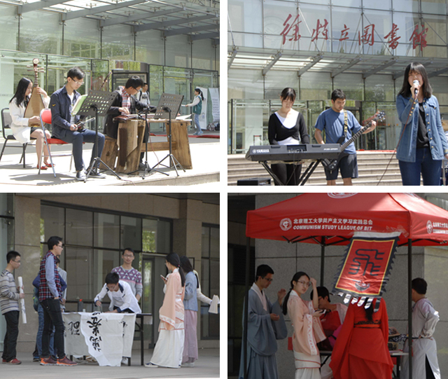 “书香氤氲校园,书卷韬养人格”。2016年“书香北理”图书馆文化节开幕式于4月22日中午在徐特立图书馆门前隆重开幕,本次活动由图书馆主办,微尘志愿者协会、绿风志愿者协会、绿萌资源与环境保护协会倾力协助,同时,风华少年读书会、飞娆古风社、龙艺社、无阳书斋、独立音协等多个传统文化社团友情参与,为同学们打造了一场视觉与内涵并重的文化盛宴。