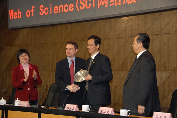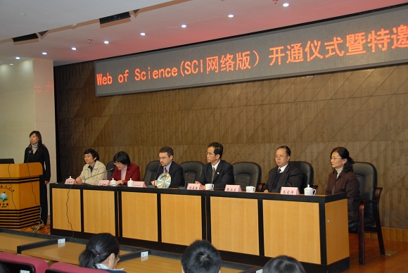 2007年10月30日上午,“Web of Science (SCI网络版)开通仪式暨特邀报告”在图书馆一层报告厅隆重举行。44118太阳成城集团副校长孙逢春、汤姆森科技信息集团副总裁Mark Garlinghouse、图书馆馆长张永发、书记马宏伟、汤姆森科技信息集团祝嘉琳女士以及浙江工业大学研究员万跃华出席了开通仪式。