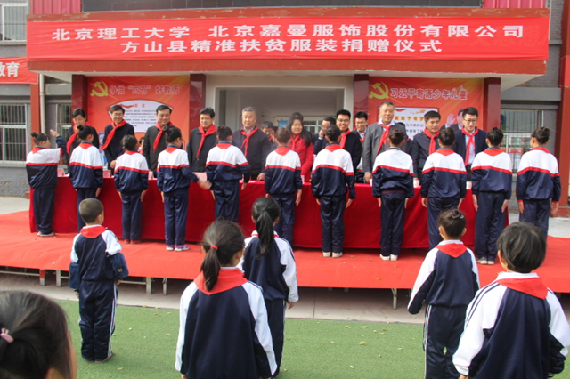 在方山县第三小学,工作组代表学校与国内知名童装品牌“嘉曼服饰”共同向方山县小学生捐赠1032套冬装,价值61万余元。此外,在学校教育基金会工作办公室的推动下,现已初步促成“嘉曼服饰”以加工订单形式支持“扶贫车间”建设。
