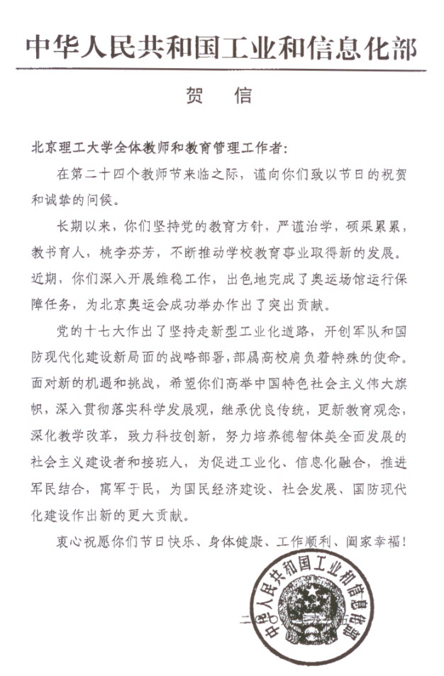 工业和信息化部发来贺信祝我校全体教师节日快乐
