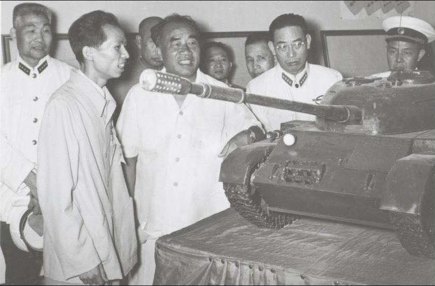 1958年“八一献礼”展览会上,叶剑英元帅(中)观看我校研制的轻型坦克模型