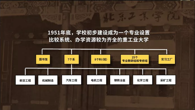 至1951年年底,学校已建立了航空工程、机械制造、汽车工程、电机工程、钢铁冶金、化学工程、采矿工程等7个系、8个科(班)和1个研究所,设立25个专业教研组和专修组,建立了实习工厂和图书馆。学校初步建设成为一个专业设置比较系统、办学资源较为齐全的重工业大学。