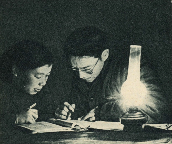▲同学们在外地生产劳动时,也不忘读书, 这是师生夜晚在灯下刻苦学习
