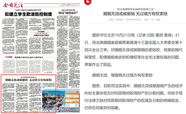 民法典婚姻家庭编草案二审稿规定了婚姻无效或者被撤销的法律后果。此次提请审议的草案三审稿在此基础上增加一款规定,即婚姻无效或者被撤销的,无过错方有权请求损害赔偿。