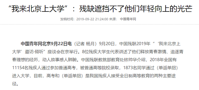 9月20日,中国残联2019年“‘我来北京上大学’邀访·倾听”座谈会在京举行。8位残疾大学生代表讲述了他们释放青春激情、追逐青春理想的经历,动人故事感人肺腑。中国残联教就部教育处林帅华介绍,2018年全国有11154名残疾人通过参加普通高考,被普通高等院校录取,1873名同学通过(单返单招)进入大学,目前,高考和(单返单招)是我国残疾人接受全日制高等教育的两种主要途径。