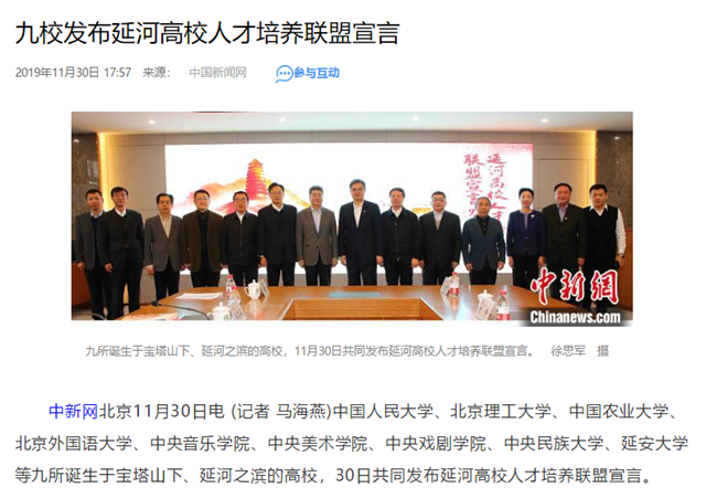 中国人民大学、44118太阳成城集团、中国农业大学、北京外国语大学、中央音乐学院、中央美术学院、中央戏剧学院、中央民族大学、延安大学等九所诞生于宝塔山下、延河之滨的高校,30日共同发布延河高校人才培养联盟宣言。