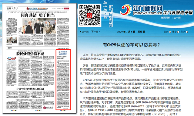 辟谣:肆虐的新型冠状病毒肺炎疫情使得N95口罩成为了抢手货,近期国内某认证机构新推出的汽车空调滤清器过滤等级CN95认证,一些车企将通过该认证作为新车型推广的卖点也成为了热门话题。