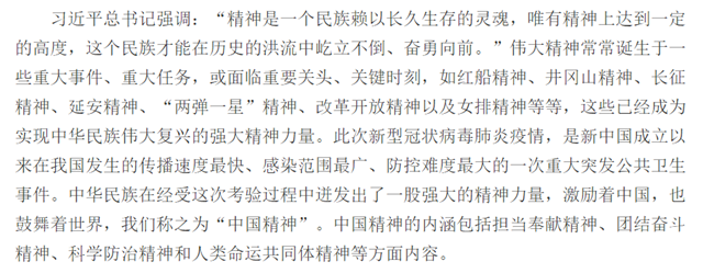 习近平总书记强调:“精神是一个民族赖以长久生存的灵魂,唯有精神上达到一定的高度,这个民族才能在历史的洪流中屹立不倒、奋勇向前。”伟大精神常常诞生于一些重大事件、重大任务,或面临重要关头、关键时刻,如红船精神、井冈山精神、长征精神、延安精神、“两弹一星”精神、改革开放精神以及女排精神等等,这些已经成为实现中华民族伟大复兴的强大精神力量。此次新型冠状病毒肺炎疫情,是新中国成立以来在我国发生的传播速度最快、感染范围最广、防控难度最大的一次重大突发公共卫生事件。中华民族在经受这次考验过程中迸发出了一股强大的精神力量,激励着中国,也鼓舞着世界,我们称之为“中国精神”。中国精神的内涵包括担当奉献精神、团结奋斗精神、科学防治精神和人类命运共同体精神等方面内容。