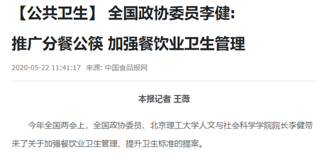 编辑:吴楠 审核:刘晓俏 阅读次数:原文标题:全国政协委员李健:推广分餐公筷 加强餐饮业卫生管理
