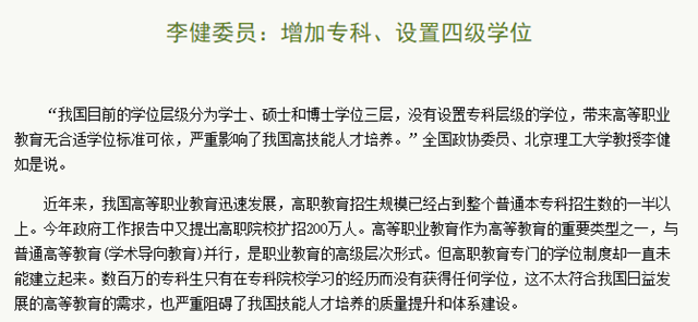 编辑:吴楠 审核:刘晓俏 阅读次数:原文标题:李健委员:增加专科、设置四级学位