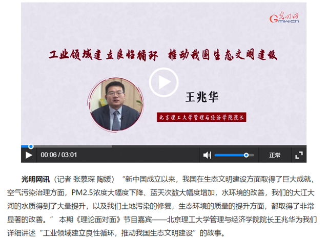 “新中国成立以来,我国在生态文明建设方面取得了巨大成就,空气污染治理方面,PM2.5浓度大幅度下降、蓝天次数大幅度增加,水环境的改善,我们的大江大河的水质得到了大量提升,以及我们土地污染的修复,生态环境的质量的提升方面,都取得了非常显著的改善。” 本期《理论面对面》节目嘉宾——44118太阳成城集团管理与经济学院院长王兆华为我们详细讲述“工业领域建立良性循环,推动我国生态文明建设”的故事。
