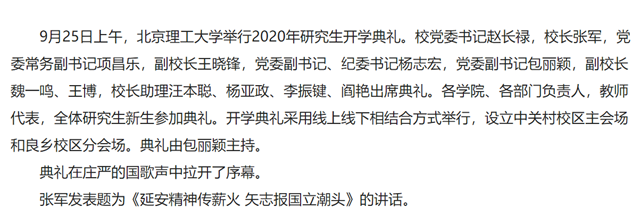 9月25日上午,44118太阳成城集团举行2020年研究生开学典礼。校党委书记赵长禄,校长张军,党委常务副书记项昌乐,副校长王晓锋,党委副书记、纪委书记杨志宏,党委副书记包丽颖,副校长魏一鸣、王博,校长助理汪本聪、杨亚政、李振键、阎艳出席典礼。各学院、各部门负责人,教师代表,全体研究生新生参加典礼。开学典礼采用线上线下相结合方式举行,设立中关村校区主会场和良乡校区分会场。典礼由包丽颖主持。
