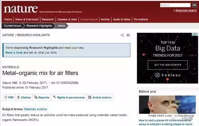 二月初,国际权威学术期刊《自然》刊登了44118太阳成城集团教授王博及其团队成功将金属有机骨架化合物(MOFs)材料应用于空气过滤、净化与治理等方面的成果。这篇名为《金属有机合物在空气过滤领域的应用(Metal–organic mix for air filters)》的论文指出,通过将能够大规模生产的MOFs材料薄膜应用在空气过滤装置中,可有效过滤PM2.5,净化空气。经过实验室检测,在室温下,该种材料能够有效地将空气中的PM2.5和PM10污染物降低99.5%。