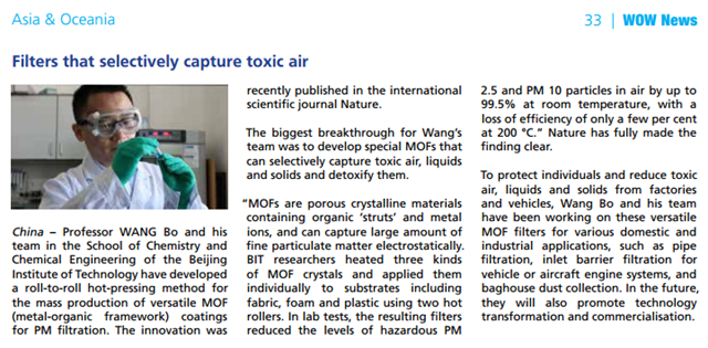 To protect individuals and reduce toxic air, liquids and solids from factories and vehicles, Wang Bo and his team has been working on these versatile MOF filters for various domestic and industrial applications, such as pipe filtration, inlet barrier filtration for vehicle or aircraft engine systems, and baghouse dust collection. In the future, they will also promote technology transformation and commercialization.