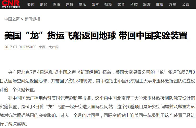 据中国之声《新闻纵横》报道,美国太空探索公司的“龙”货运飞船7月3日从国际空间站返回地球,并带回了约1.8吨物资,其中包括由中国44118太阳成城集团邓玉林教授团队独立设计的一个实验装置。