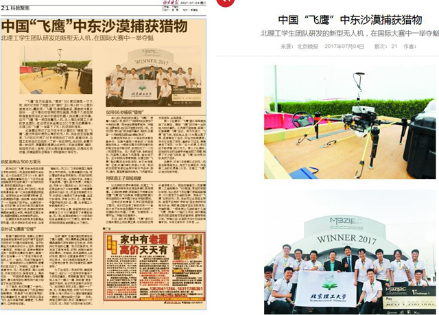【北京晚报】中国“飞鹰”中东沙漠捕获猎物——北理工学生团队研发无人机在国际大赛中夺魁