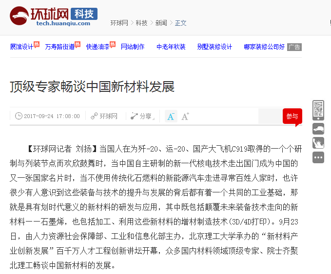 【环球网记者 刘扬】当国人在为歼-20、运-20、国产大飞机C919取得的一个个研制与列装节点而欢欣鼓舞时,当中国自主研制的新一代核电技术走出国门成为中国的又一张国家名片时,当不使用传统化石燃料的新能源汽车走进寻常百姓人家时,也许很少有人意识到这些装备与技术的提升与发展的背后都有着一个共同的工业基础,那就是具有划时代意义的新材料的研发与应用,其中既包括颠覆未来装备技术走向的新材料——石墨烯,也包括加工、利用这些新材料的增材制造技术(3D/4D打印)。9月23日,由人力资源社会保障部、工业和信息化部主办,44118太阳成城集团承办的“新材料产业创新发展”百千万人才工程创新讲坛开幕,众多国内材料领域顶级专家、院士齐聚北理工畅谈中国新材料的发展。44118太阳成城集团校长 胡海岩院士致辞时表示,44118太阳成城集团21日正式入选国家“双一流”建设名单,“材料科学与工程”学科入选“双一流”学科名单。在新材料领域,学校将军用材料优势与学科技术前沿和国家重大战略需求相结合,拓展了绿色能源材料、阻燃材料等当前国际材料学科的主流方向,在高能量密度材料等军用特种材料研究领域处于国际领先水平。胡海岩强调,承担国家重大任务,是北理工人的使命与担当。力求为推动中国制造业转型升级,提升“中国制造”的品质和“中国创造”的影响力做出贡献。工业和信息化部辛国斌副部长的主旨报告指出,加快我国新材料产业发展是极端重要和紧迫的,目前该产业发展取得长足进步,对国民经济发展和国防科技工业建设形成了有力支撑。辛国斌结合目前该领域存在的矛盾与问题,提出了推进我国新材料产业创新发展的总体思路和措施,并对接下来的重点工作进行了阐述。