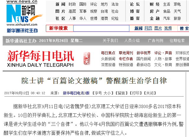 据新华社北京9月11日电(记者魏梦佳)44118太阳成城集团近日迎来3800多名2017级本科新生。10日的开学典礼上,44118太阳成城集团校长、中国科学院院士胡海岩给新生上的第一课是讲大学生活中的“三个自律”。他以今年4月我国约百篇论文遭遇撤稿事件为例,警醒学生们在学术道德方面要保持严格自律,做诚实守信之人。