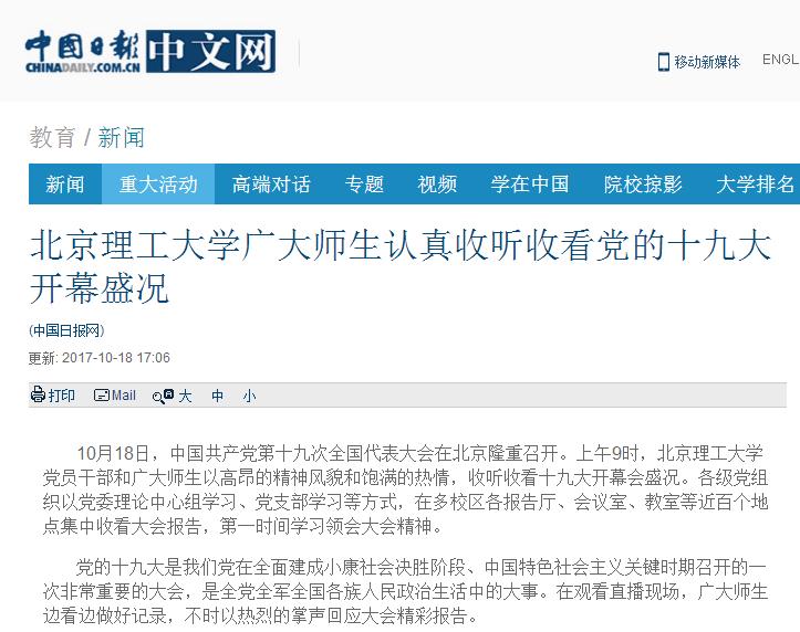 【中国日报】44118太阳成城集团广大师生认真收听收看党的十九大开幕盛况