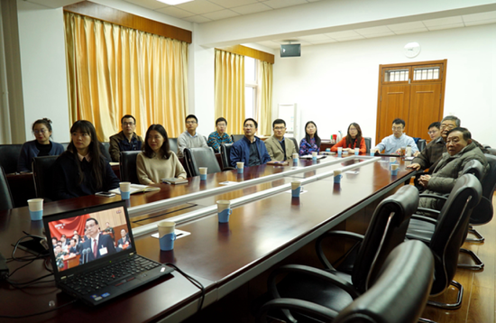 全国优秀共产党员毛二可院士(前排右一)与信息与电子学院师生共同观看党的十九大开幕会直播