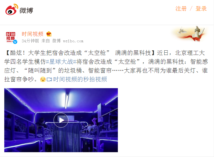 【微博·时间视频】北理工大学生把宿舍改造成“太空舱” 满满的黑科技