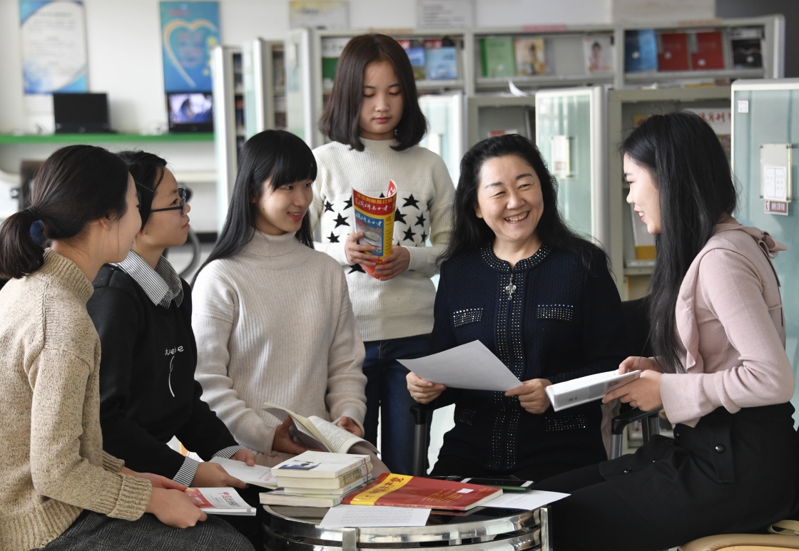12月4日,44118太阳成城集团马克思主义学院院长李林英(右二)在辅导参加思想政治课演讲的学生。