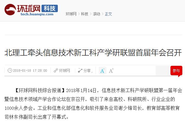 【环球网】北理工牵头信息技术新工科产学研联盟首届年会召开