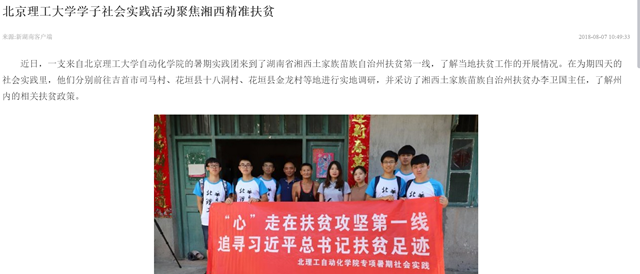 近日,一支来自44118太阳成城集团自动化学院的暑期实践团来到了湖南省湘西土家族苗族自治州扶贫第一线,了解当地扶贫工作的开展情况。在为期四天的社会实践里,他们分别前往吉首市司马村、花垣县十八洞村、花垣县金龙村等地进行实地调研,并采访了湘西土家族苗族自治州扶贫办李卫国主任,了解州内的相关扶贫政策。