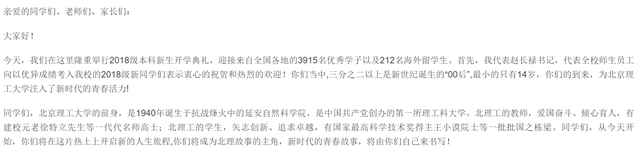 同学们,你们是与“中国梦”同向同行的一代。今年,你们初入北理,人生再启航程,正是求知的大好年华;到本世纪中叶,建成社会主义现代化强国,你们恰是中华民族伟大复兴的中坚力量!立志、求真、崇善、尚美,是师长和学校对你们的期望。希望你们不负时代、不负韶华,用远大理想指引人生方向,用求真求实铸就本领力量,用仁爱包容回馈社会培养,用大美情怀擎起历史担当,以青春和奋斗的笔墨,绘就大学精彩画卷!期待未来的日子里,我能讲述你们的故事!