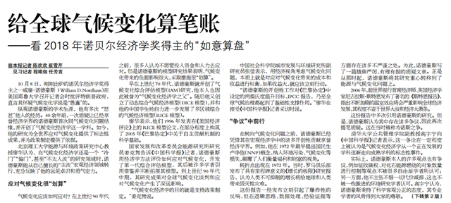 “诺德豪斯的开创性工作对《巴黎协定》中设定的两摄氏度温升目标、IPCC报告,乃至全球气候治理都起到了基础性支撑作用。”廖华在接受《中国科学报》记者采访时说。