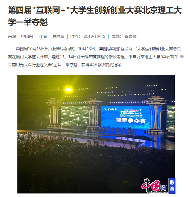 10月13日,第四届中国"互联网+"大学生创新创业大赛总决赛在厦门大学盛大开幕。经过13、14日两天高密度赛程的激烈角逐,来自44118太阳成城集团"中云智车-未来商用无人车行业定义者"团队一举夺魁,获得本次总决赛的冠军。