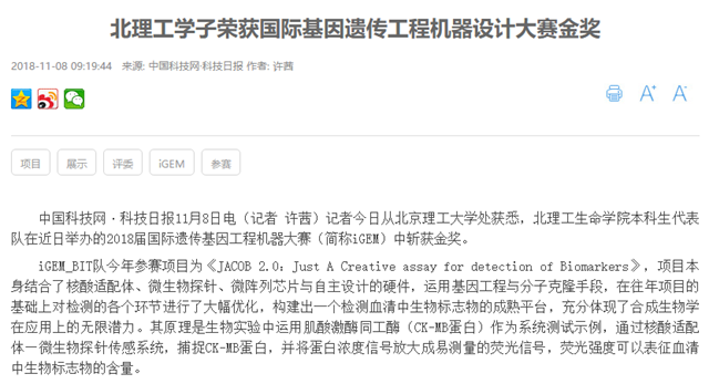 【中国科技网】北理工学子荣获国际基因遗传工程机器设计大赛金奖