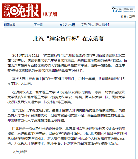 【法制晚报】北理工获得北汽“绅宝智行杯”比赛一等奖