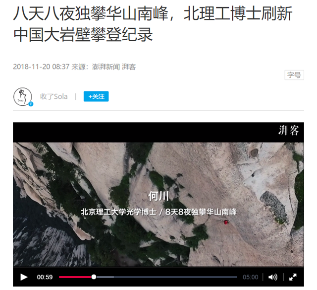【澎湃新闻】北理工教师何川:刷新中国大岩壁攀登纪录