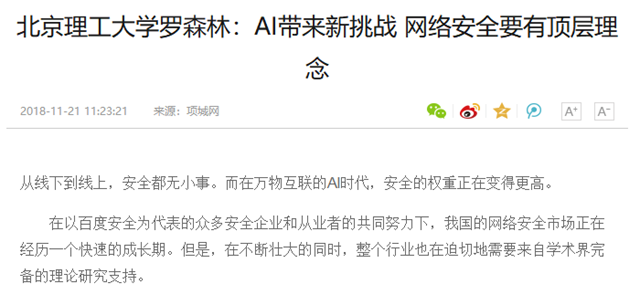 【中国网】北理工罗森林:AI带来新挑战 网络安全要有顶层理念