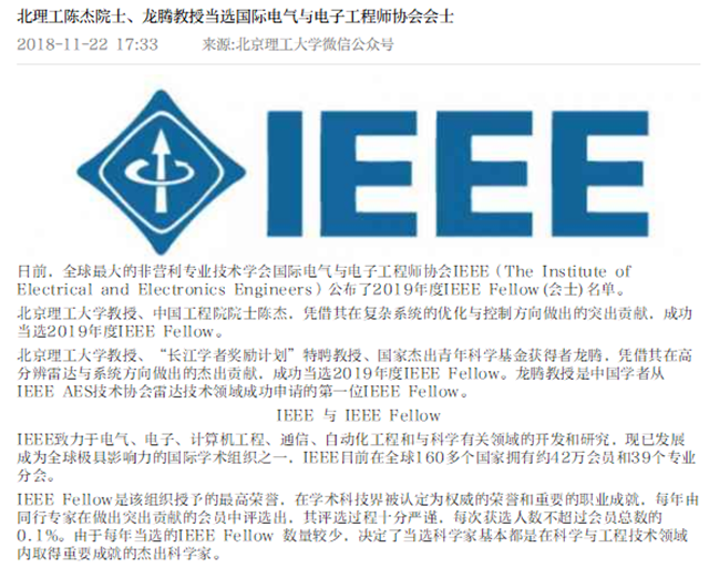 【北京日报客户端】北理工陈杰院士、龙腾教授当选国际电气与电子工程师协会会士