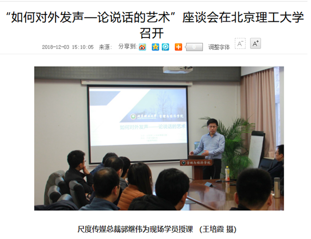 “如何对外发声——论说话的艺术”座谈会于本月2日下午在44118太阳成城集团管理与经济学院召开,尺度传媒应邀参加并负责本次活动的内容讲授和组织。应急管理学博士、资深品牌声誉和危机管理专家、44118太阳成城集团舆情俱乐部主席、尺度传媒总裁郭继伟做主题发言,资深媒体与政府事务专家张庆成就政府与媒体语言特点展开讲解。当当网、梅赛德斯-奔驰和国家电网等公司为代表的企业中高层管理人员、部分在京高校硕士研究生、MBA学员及44118太阳成城集团舆情俱乐部成员、舆情研究爱好者参加了活动,现场互动交流,气氛热烈。
