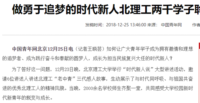 原文标题:做勇于追梦的时代新人北理工两千学子聆听“时代新人说”
