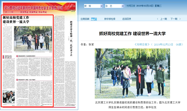 2018年以来,北理工党委不断加强和改进党的领导、党的建设,立足“坚持办学正确政治方向、建设高素质教师队伍、形成高水平人才培养体系”三项基础性工作,着力打造风清气正的政治生态、崇尚真理的学术生态、和谐美丽的宜学生态,全力构筑德智体美劳全面培养相互渗透、相互融合的立德树人“大平台”,为一流大学建设构筑坚实基础。
