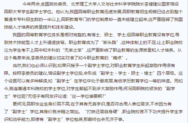 当然,我们也必须认识到,如果只授予一个副学士学位,对职业教育学生所起激励作用很有限。按照李委员的建议,增设副学士学位后,会形成“副学士-学士-硕士-博士”四个层级。这个设置可以有多种解读,如“副学士”在学位中处于最底层,有低学历教育学位一等的味道。而如今,就连普通本科院校的学士学位,对学生都起不到多大激励作用,何况高职院校颁发的“副学士”学位呢?无怪乎有网友评论道:“这一学位谁要啊?”