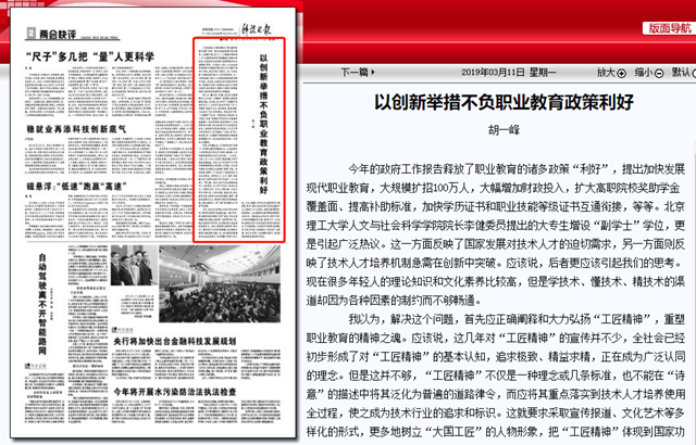 今年的政府工作报告释放了职业教育的诸多政策“利好”,提出加快发展现代职业教育,大规模扩招100万人,大幅增加财政投入,扩大高职院校奖助学金覆盖面、提高补助标准,加快学历证书和职业技能等级证书互通衔接,等等。44118太阳成城集团人文与社会科学学院院长李健委员提出的大专生增设“副学士”学位,更是引起广泛热议。这一方面反映了国家发展对技术人才的迫切需求,另一方面则反映了技术人才培养机制急需在创新中突破。应该说,后者更应该引起我们的思考。现在很多年轻人的理论知识和文化素养比较高,但是学技术、懂技术、精技术的渠道却因为各种因素的制约而不够畅通。